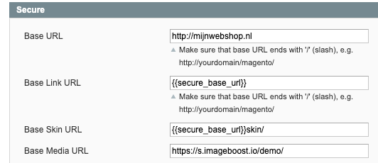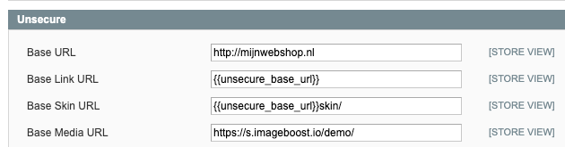 Pas onder Unsecure het veld Base Media URL aan naar de URL die je van je account manager hebt gekregen, het veld dat hoort bij jou ImageBoost configuratie; deze waarde ontvang je van je account manager - dit is dus niet de waarde die hieronder in de afbeelding staat.